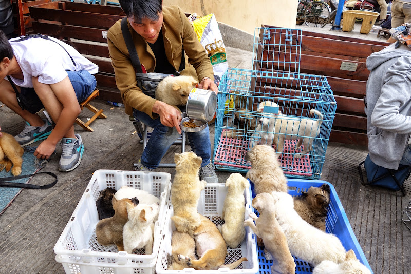 Peu de fleurs, quelques marchands avec leurs cages et leurs oiseaux à vendre, mais beaucoup de chiens et chats entassés dans des petites cages et des insectes vivants et asticots.