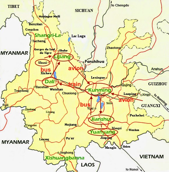 Guilin /Kunming en avion  puis après avoir été à Jiangsui et Yuanyang retour sur Kunming pour repartir sur Dali.