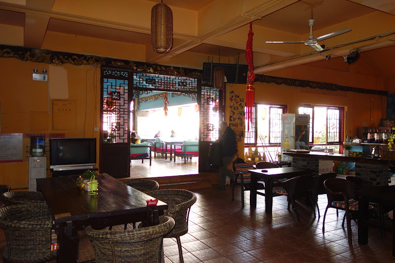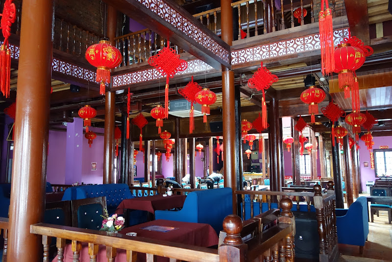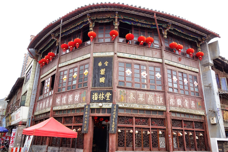 C'est un vieux bâtiment rescapé, en bois, couleur lie de vin, avec de belles décorations. Entre les gratte-ciel et le centre commercial, tout près de Huaniao Shichang, le marché aux fleurs.
