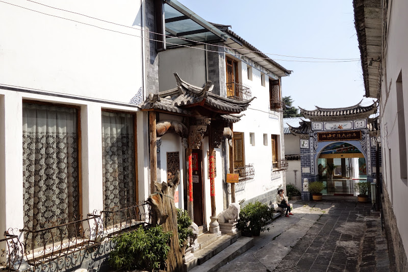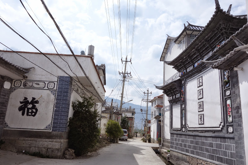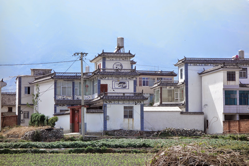 "c'est ici que vivent plusieurs familles du peuple Baï .. Les habitants sont principalement fermiers et pêcheurs. Les villages abritent des maisons très anciennes aux belles cours intérieures fleuries et entourées de murs destinés à préserver l'intimité et à contrer les mauvais esprits. Les splendides peintures murales illustrent la nature, les oiseaux, etc ... et sont une ode à la paix et à l'amour. Chaque maison se composent de plusieurs bâtiments, d'un portail d'entrée monumental et d'une toiture en tuile grise et respectent les règles de l'architecture typique."