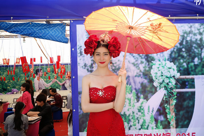 Devant un stand de photos sur la grande place piétonne .. elles sont très jolies les chinoises... avec un teint de porcelaine.. C'est pour cela que dans les rues ont les voit avec des ombrelles pour se protéger du soleil .. elles ne veulent pas bronzer.